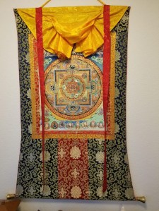 The whitewashed main room blazes with color. Snugged with giant embroidered floor pillows, it serves as both sitting room and sleeping room for the entire family of four. Tseten’s thankgas take up every available foot of wall. As well as being intricate, beautiful art, these are also religious icons. He and I have analyzed the symbolism of every detail of the one I purchased. The canvas is covered with a central mandala, with several dozen lamas, deities, bodhisattvas, and many other stylized figures arrayed around it. The pigments, patiently ground by hand from semi-precious stones, are brilliant, and the silk hangings glow in emerald, scarlet, gold, and sapphire.